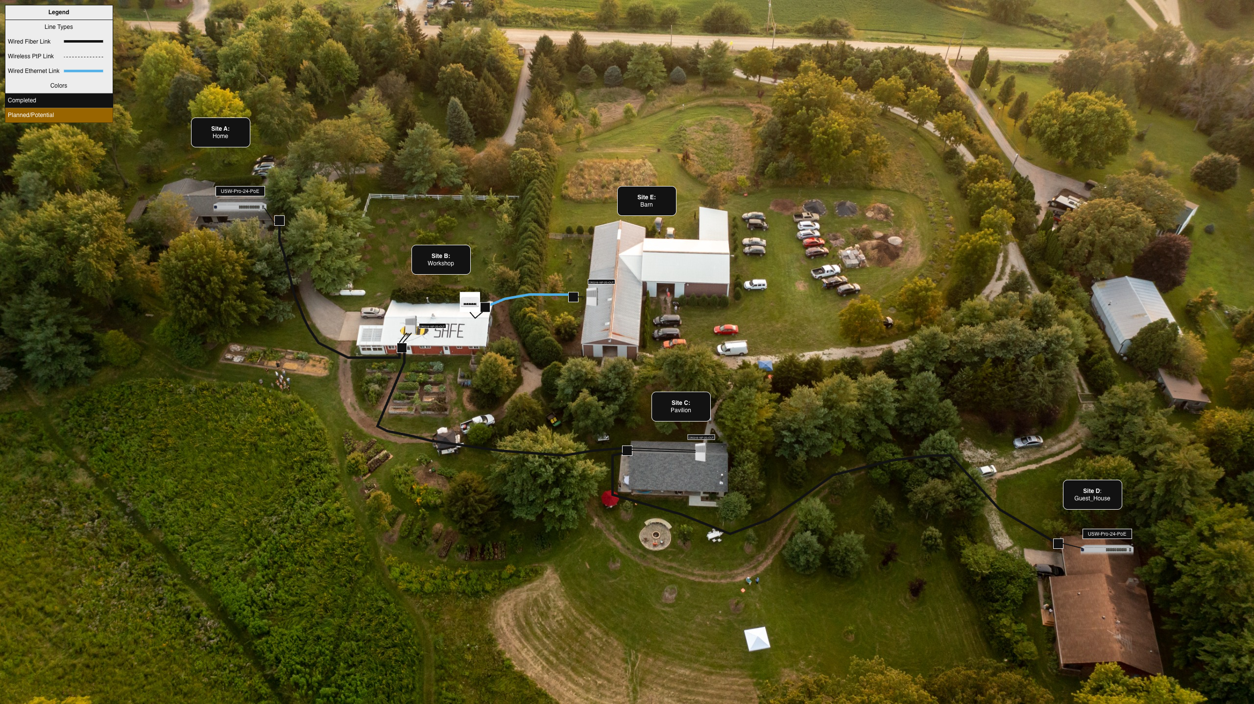 For the final distribution, we brought the connection to Site D, where the HelpX and WWOOF workers are primarily housed during their stay. As with Site A to Site B and Site B to Site C, a fiber optic cable within a conduit was buried connecting to switches at each end in series. However, since Site D had the environmental advantage of being indoor, a Ubiquiti switch was used to save costs. Additionally, this switch has Layer 3 capability, enabling the hosts’ to throttle and administer traffic at Site D for their specific needs.